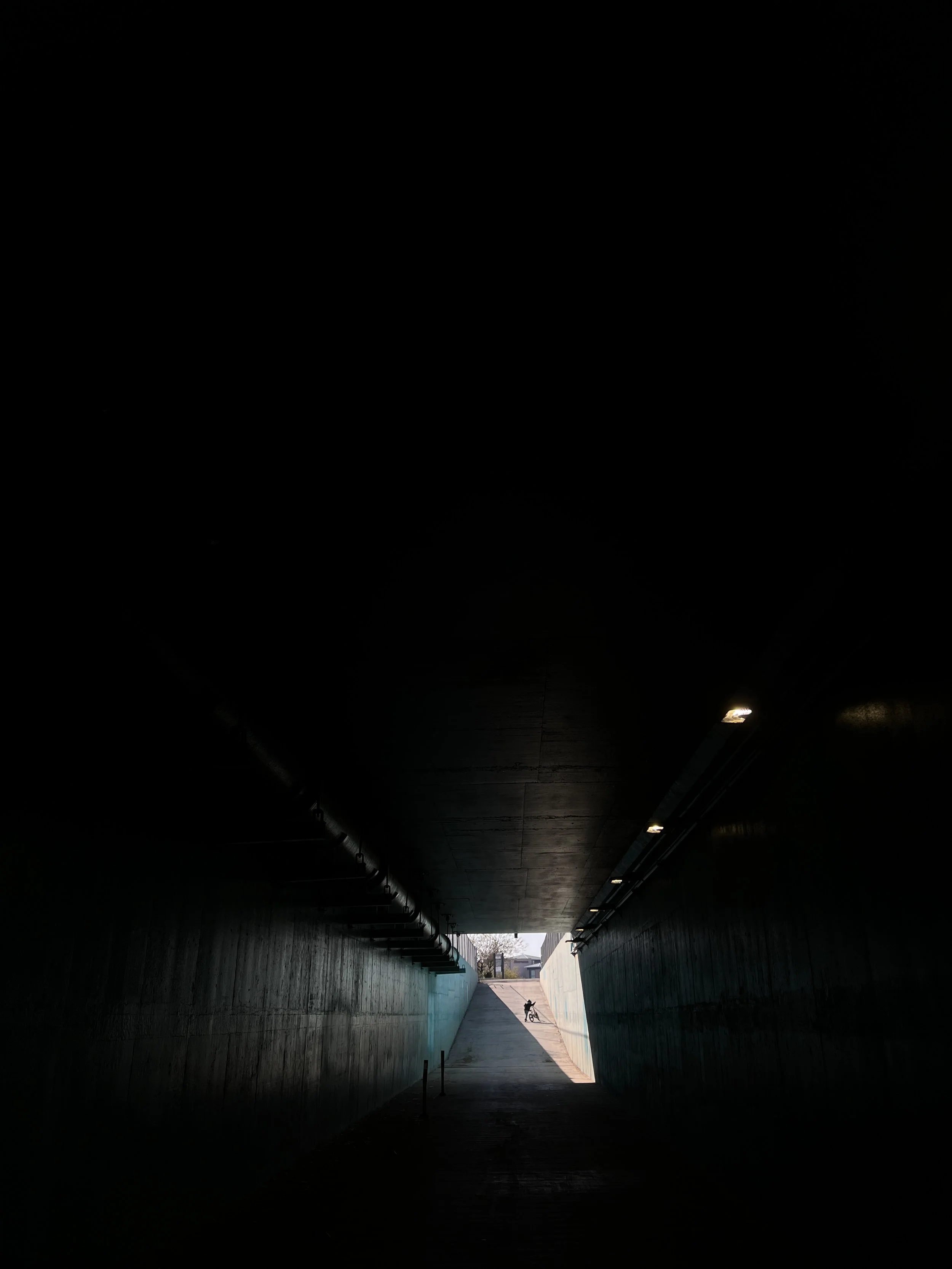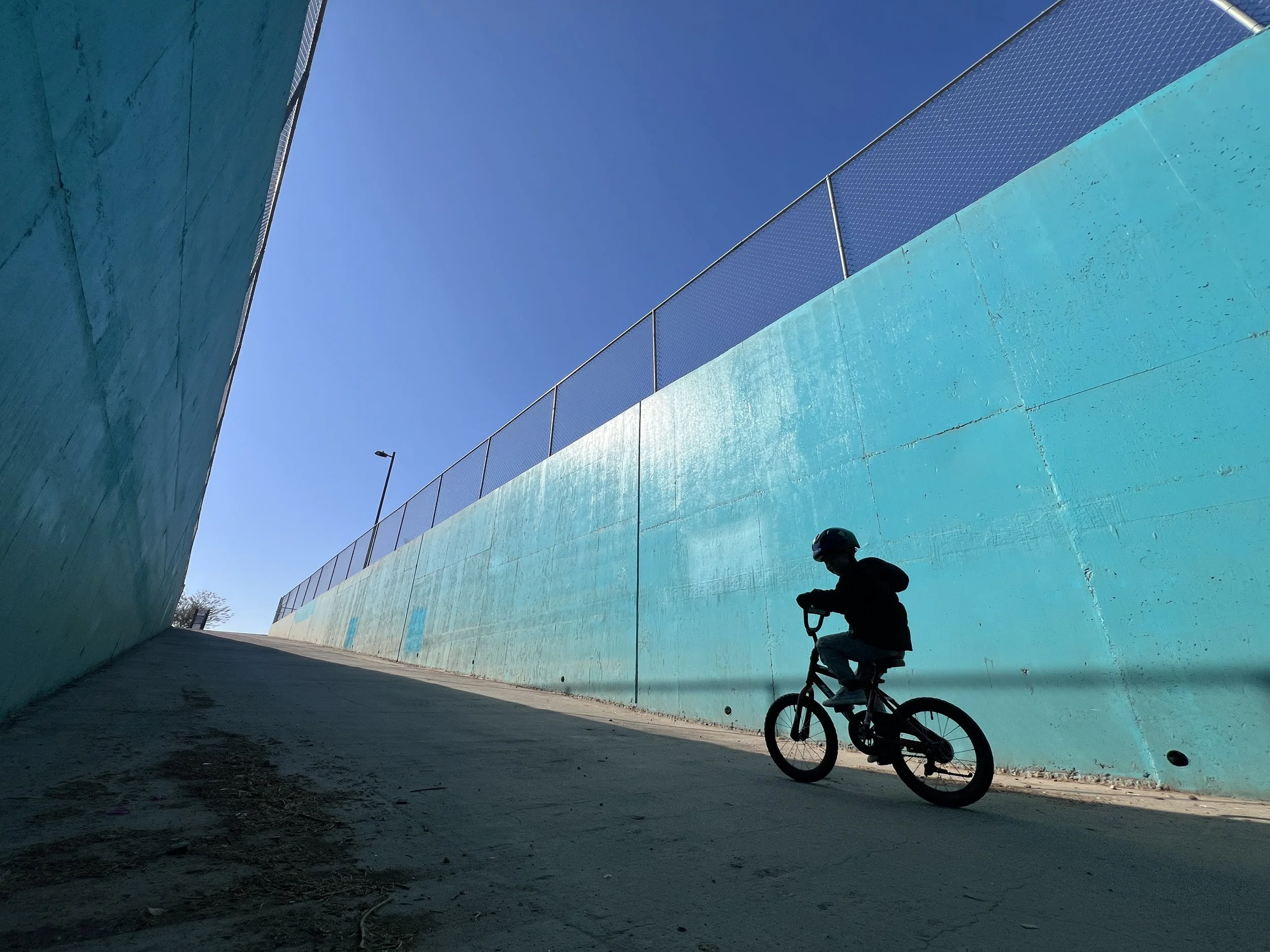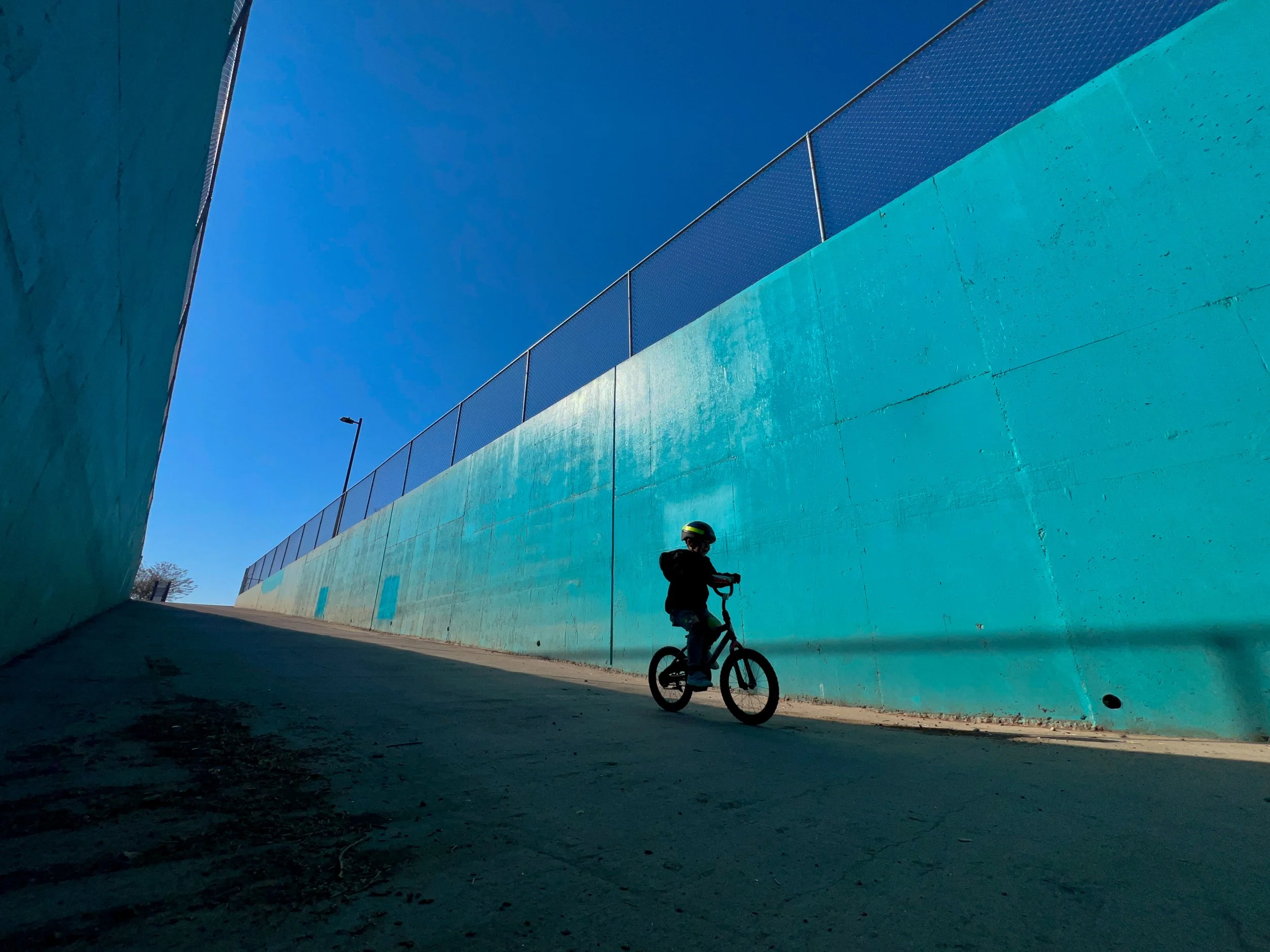 When I turned around, I noticed that this side of the slope was a lot steeper which blocked out most of the distractions above the ground. Also when my son was in that patch of light, it creates a great silhouette. Now we are getting somewhere. However, with the tunnel and everything, we had so much negative space that is just black. It felt really heavy or even depressing especially when you can see that lone kid with his bike. this is not what I was going for—this is a happy and chill space. Not a sad scene.