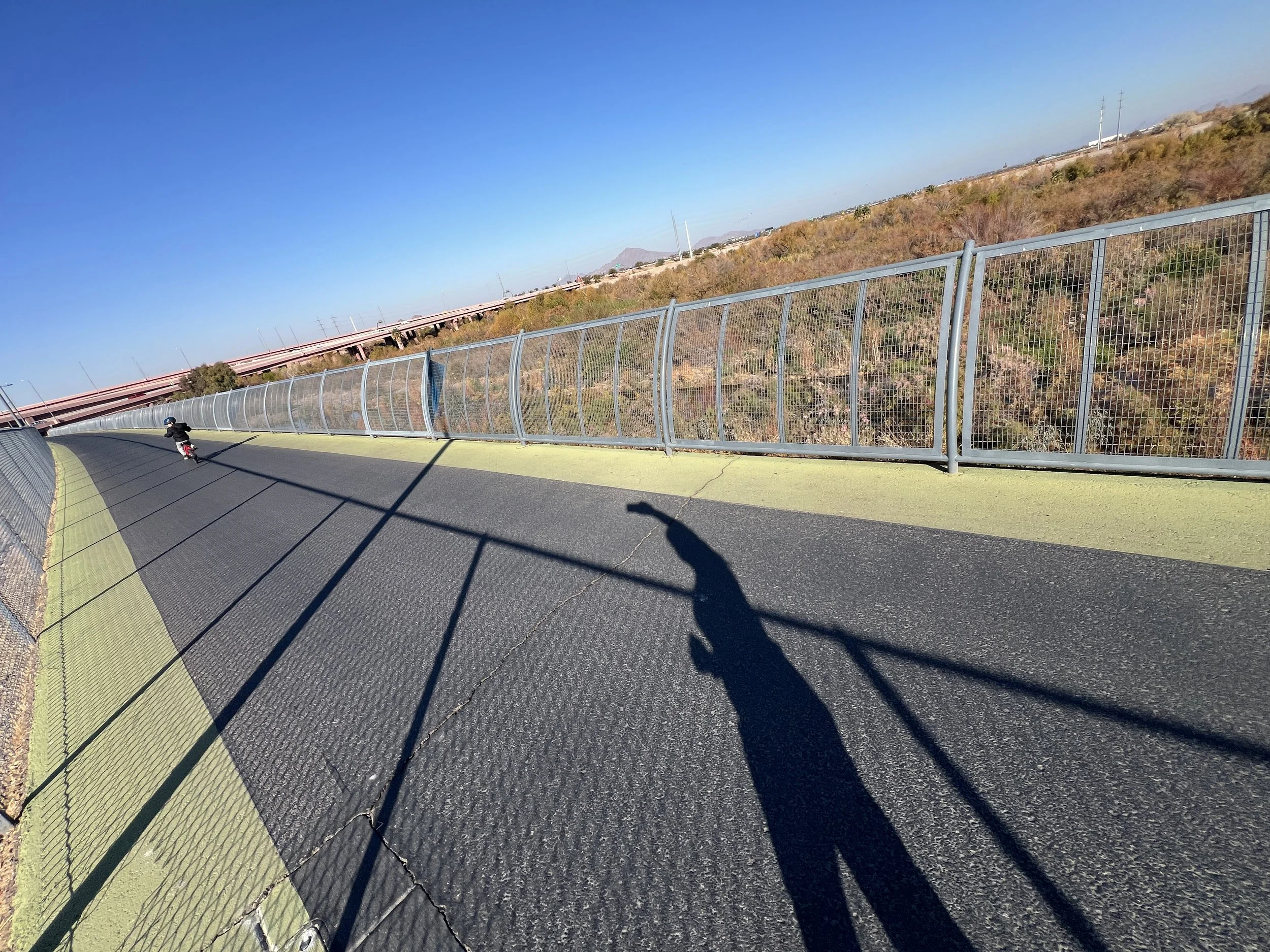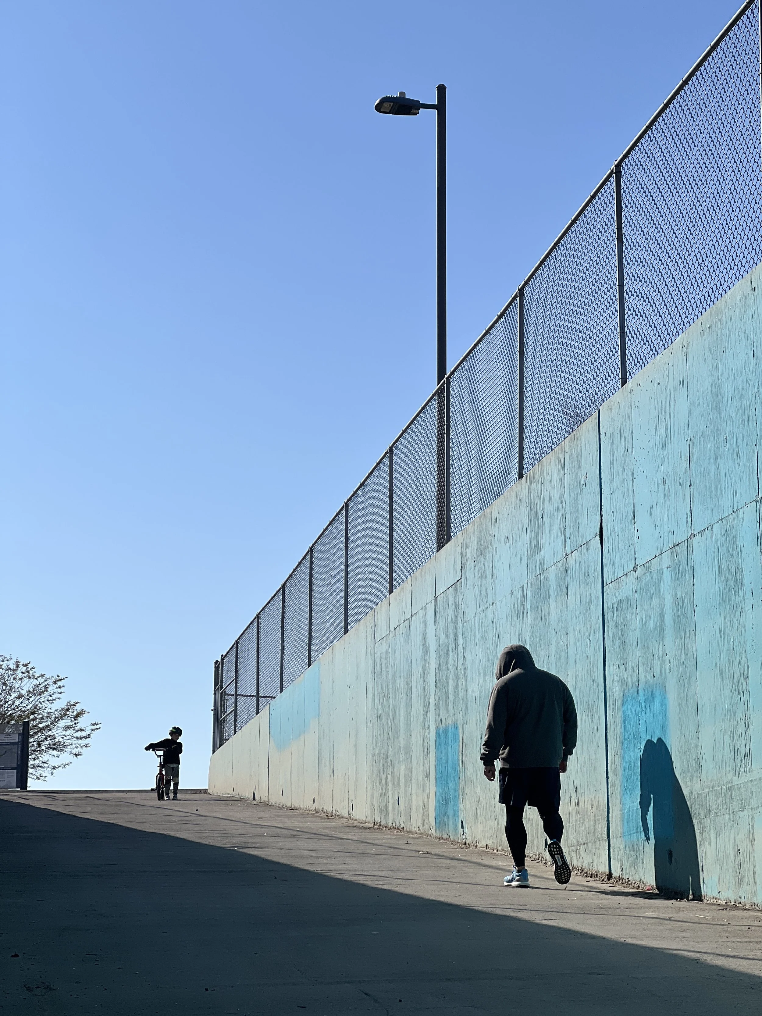 I noticed the shadow on the ground, and I love a good pattern. I tried to take a photo while running at first. It was hard to keep up with the pace, keep my hands steady, and get a good composition with where my son was in relationship to me and all the patterns on the ground. So I gave up.