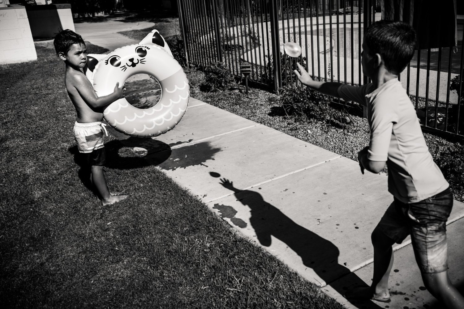 The shots I got: <A story about different ways of playing water balloons, especially when the water balloons would not pop easily with kids' throwing strengths.>